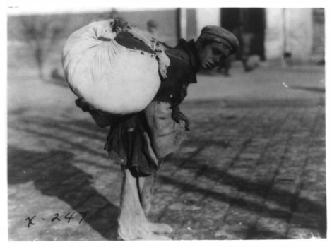 Реч је о прилично уобичајеној, свакодневној сцени. Вероватно је у питању неки просјак, тешка сиротиња, који је сву своју имовину стрпао у завежљај који носи на леђима и од којег се не одваја.