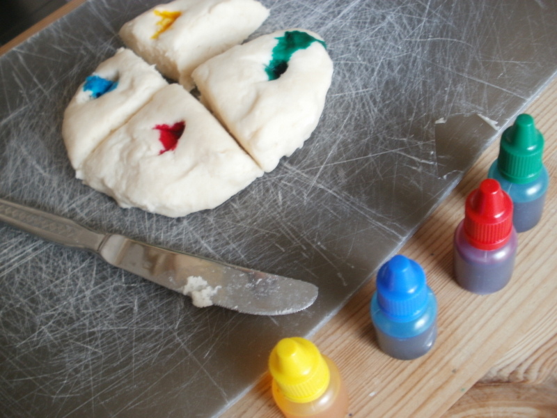 Тесто извадите из посуде и месите га док је маса још топла, како би се сви састојци лакше сјединили. Након тога поделите тесто на четири дела а затим направите мање кугле. Палцем направите рупу у средини сваке кугле – радите то на папиру за печење. Узмите боју по жељи, пар капи капните у рупу и пажљиво месите. Најбоље радити са рукавицама, како боја не би остајала на рукама. Уколико не волите да носите рукавице приликом рада, боју оперите са прашком за веш.