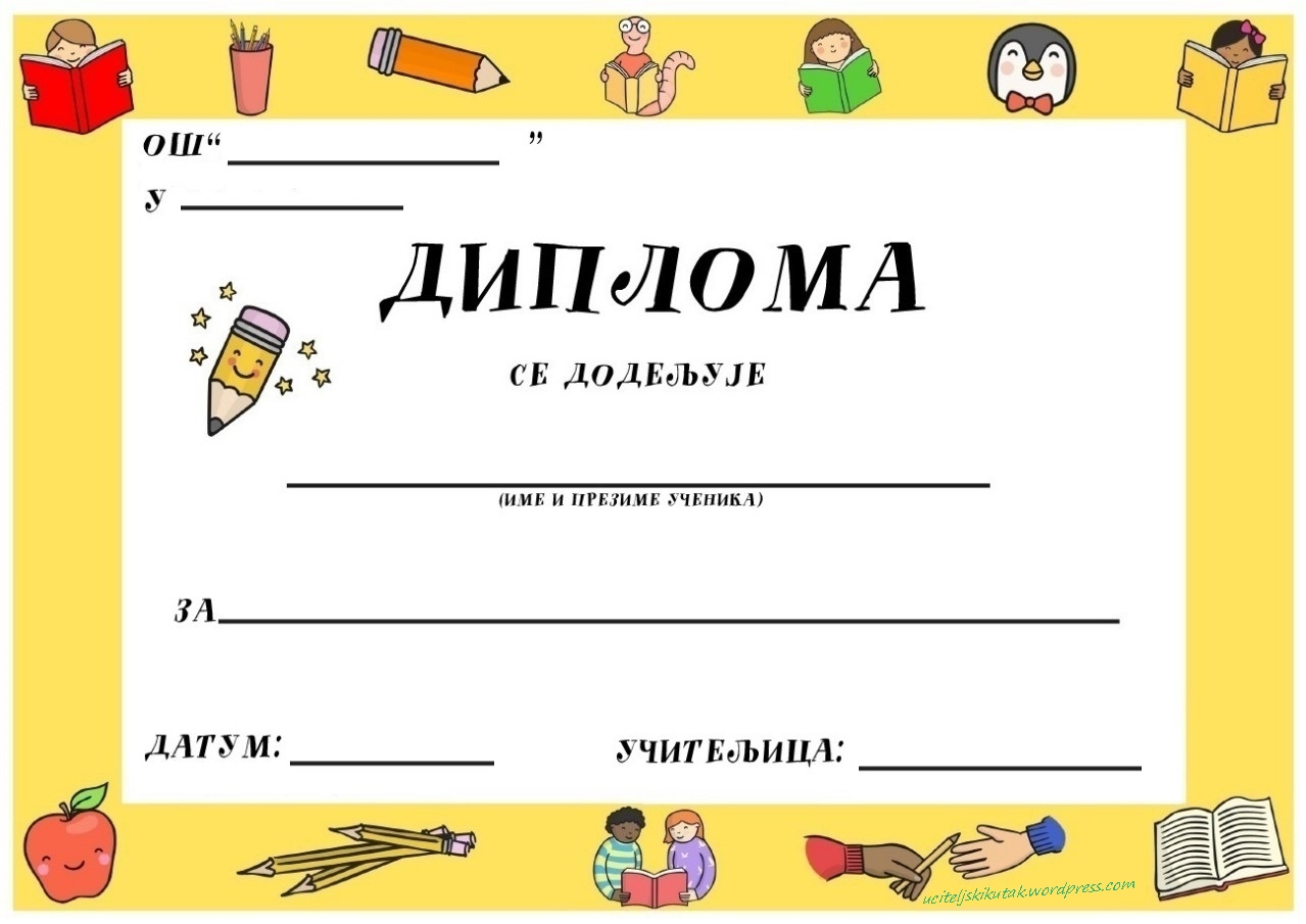 У мојој школи не постоје званичне дипломе за завршени први разред, одличан успех и примерно владање, а деца први пут на почетку свог школског пута добијају неку процену за своје ангажовање, рад, труд и резултат, па сам пожелела да их обрадујем дипломама за крај првог разреда…