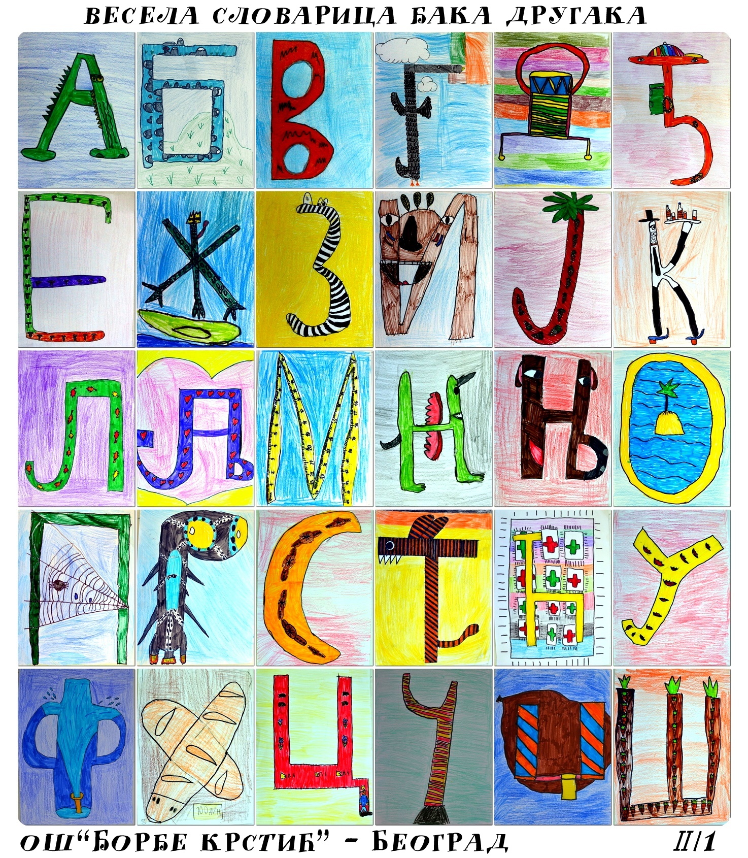 A – алигатор, Б – брдо, В – ватра, Г – голуб, Д – добош, Ђ – ђак, Е – ексер, Ж – жаба, З – зебра, И – индијанац, Ј – јагода, К – конобар, Л – лист, Љ – љубав, М – метар, Н – ној, Њ – њушка, О – острво, П – паук, Р – ракета, С – сат, Т – тигар, Ћ – ћилим, У – усне, Ф – фонтана, Х – хлеб, Ц – цвет, Ч – четка, Џ – џак, Ш – шаргарепа.