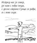 Кроз први слајд смо обновили знање другог разреда о вним објектима који нам помажу да се снађемо у окружењу, уличним бројевима, као и и смеровима кретања. Кроз други слајд ученици се упознају са новим појмом – оријентација, његовим пореклом и значењем и уводе се у садржај нове лекције. Филм о природним оријентирима је одлично прихваћен , као и објашњење како ради компас. Уз помоћ илустрације дечака и излазећег сунца смо одредили стране света. Запис је нешто дужи, али садржи све кључне речи и бојом их одваја као битне. На крају часа, опуштање уз музику и укрштеницу.
