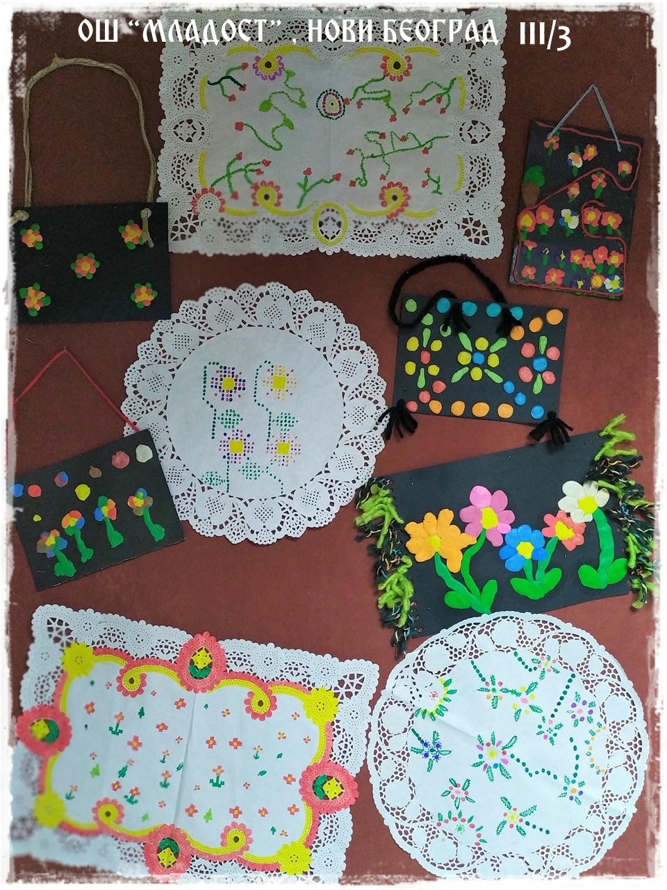Покушали смо да оживимо вез наших бака, вез на столњаку, шустикли, кецељи, торбици за школу, чарапи, хаљини, кошуљи …. Ово су наши радови: