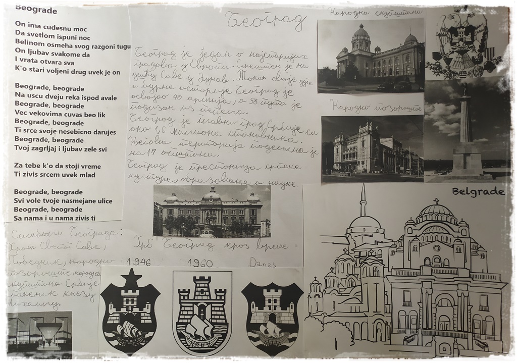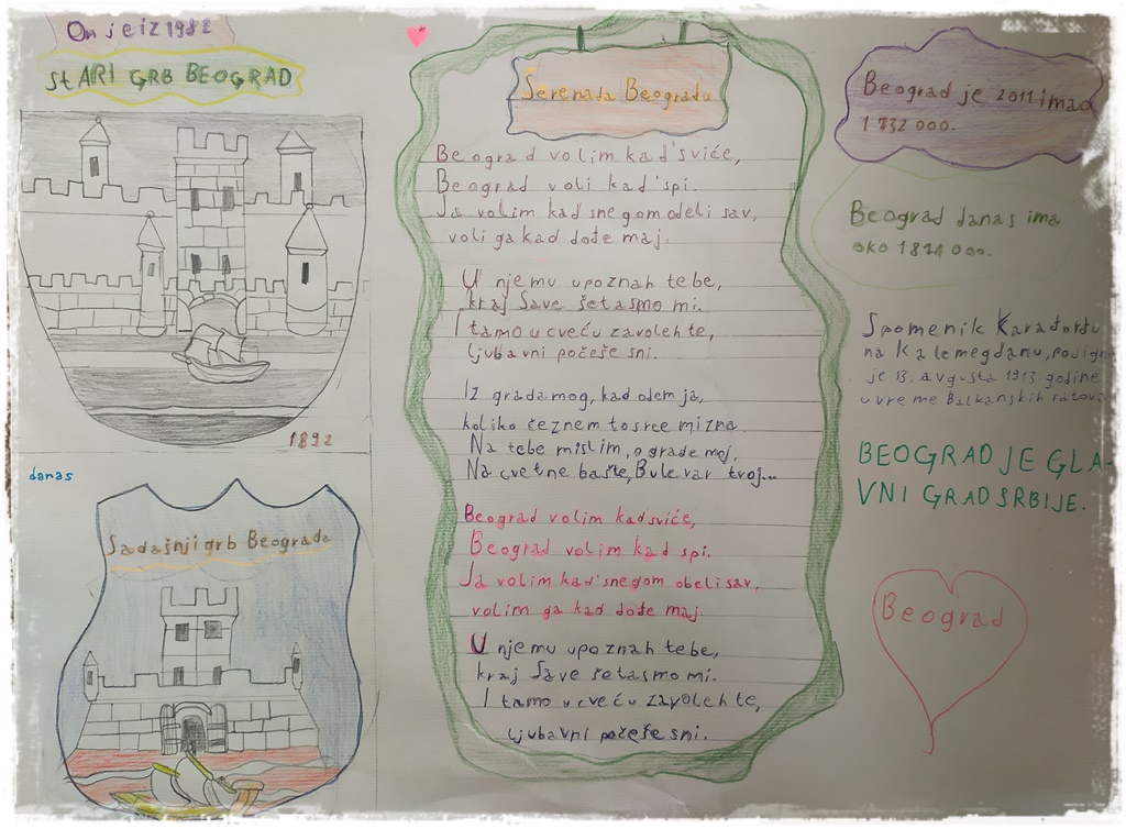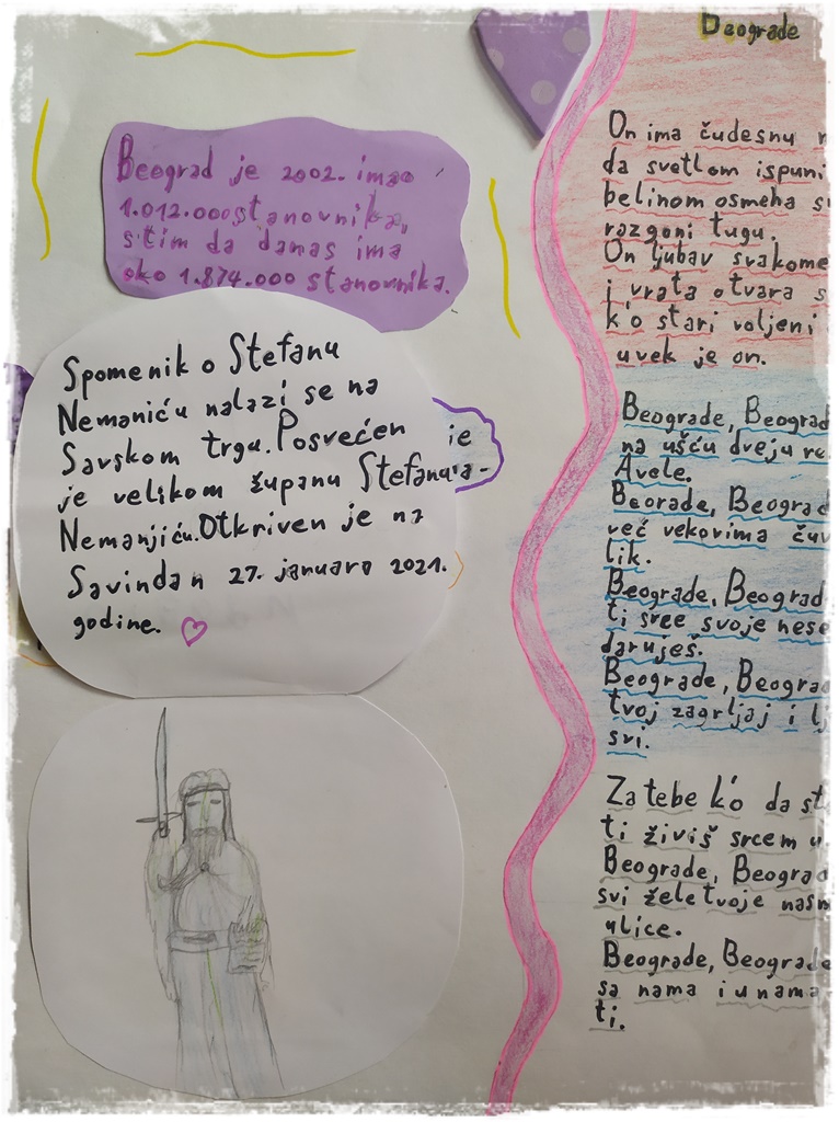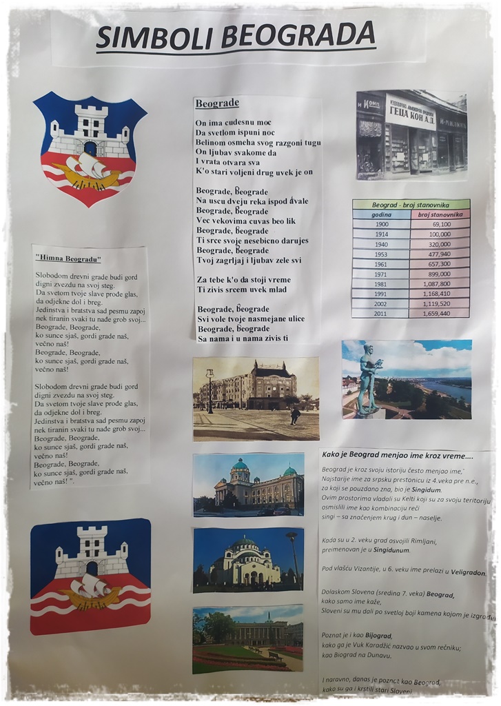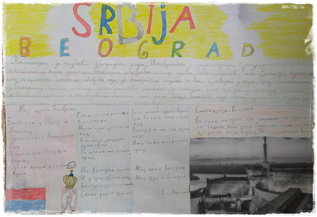 Пројектна настава у којој су међусобно повезани садржаји природе и друштва, српског језика, музичке културе, ликовне културе. Примена ИКТ- а у настави је да су подаци, фотографије преузети са интернет енциклопедија, записани, или одштампани. Истраживали смо и градове у Србији, али почети из града у ком смо рођени и упознати пре свега Београд је изазов. Раду пару.