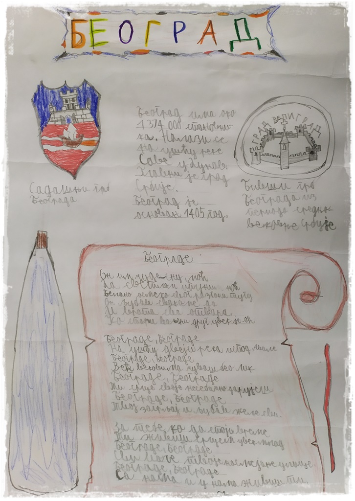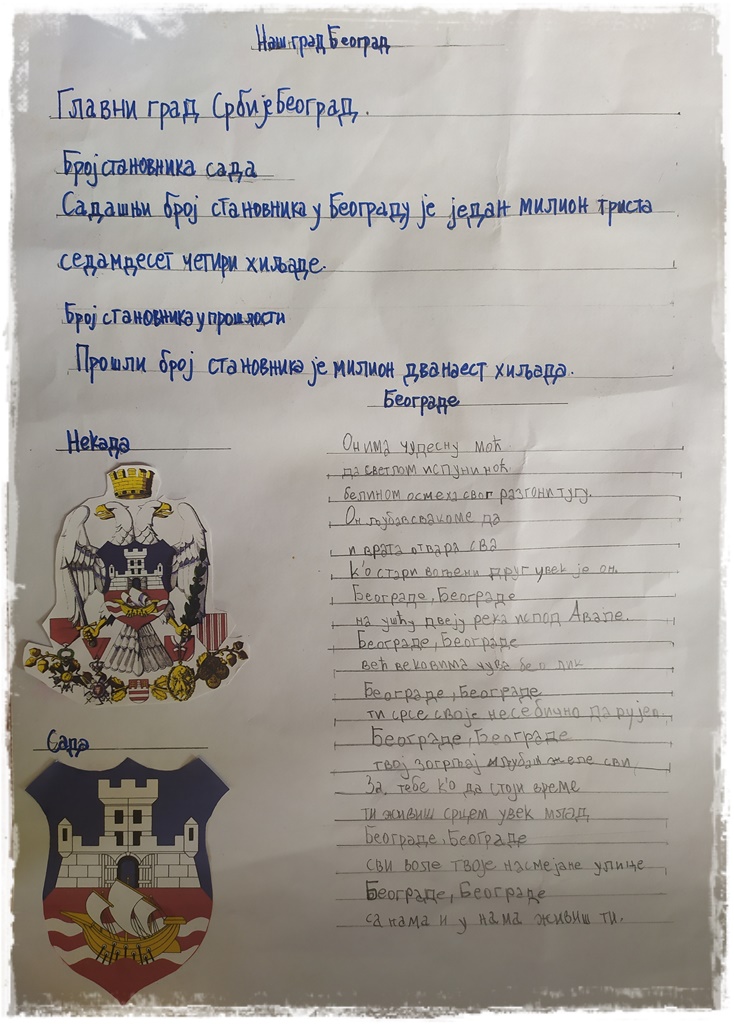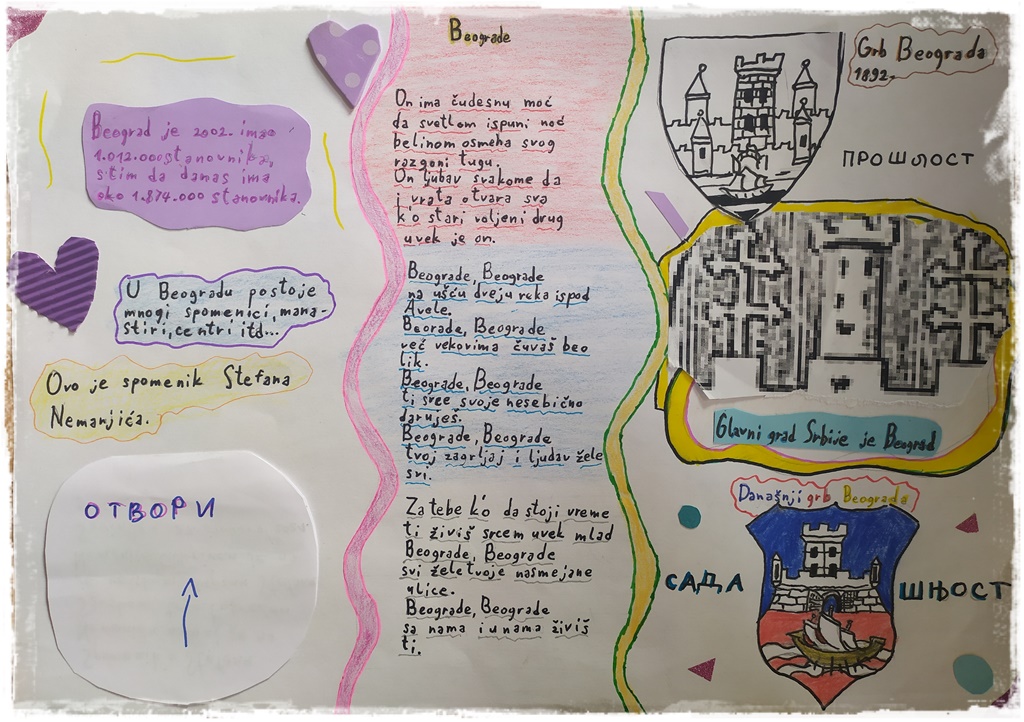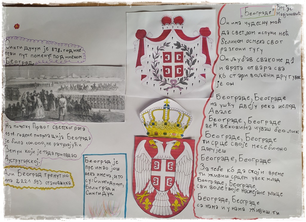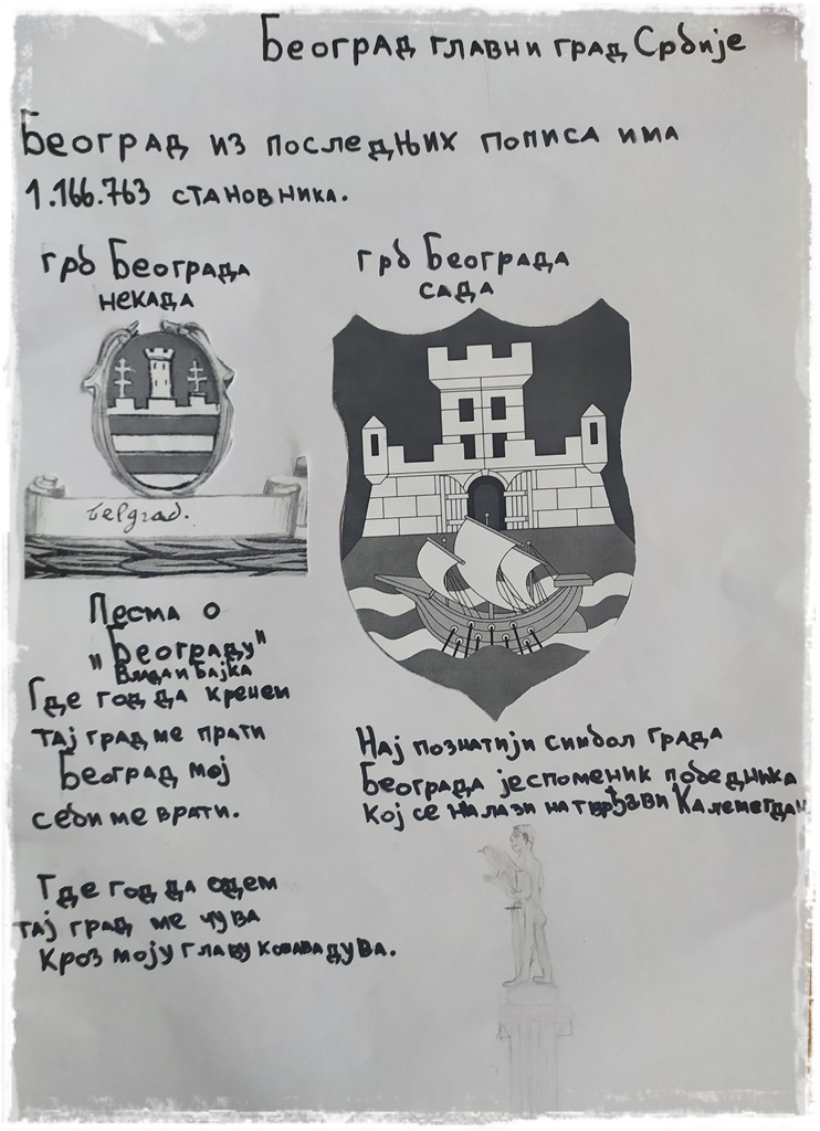 Пројектна настава у којој су међусобно повезани садржаји природе и друштва, српског језика, музичке културе, ликовне културе. Примена ИКТ- а у настави је да су подаци, фотографије преузети са интернет енциклопедија, записани, или одштампани. Истраживали смо и градове у Србији, али почети из града у ком смо рођени и упознати пре свега Београд је изазов. Раду пару.