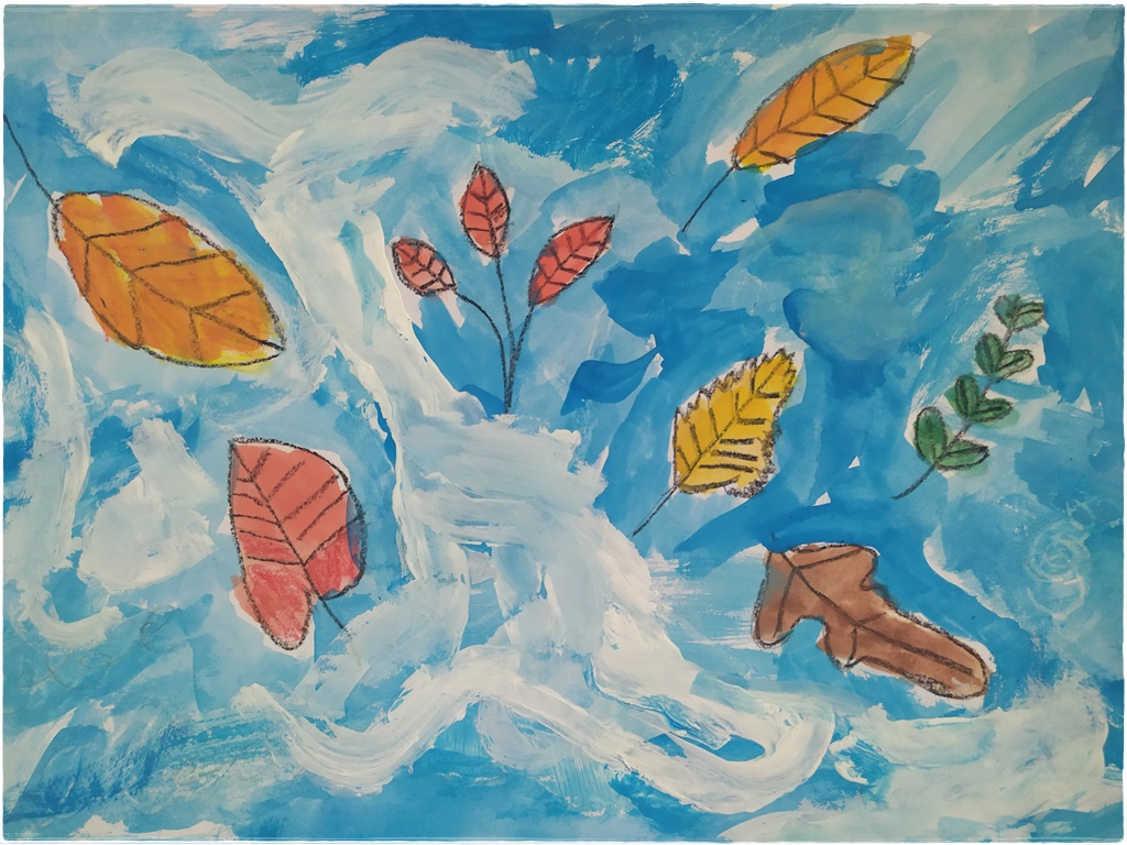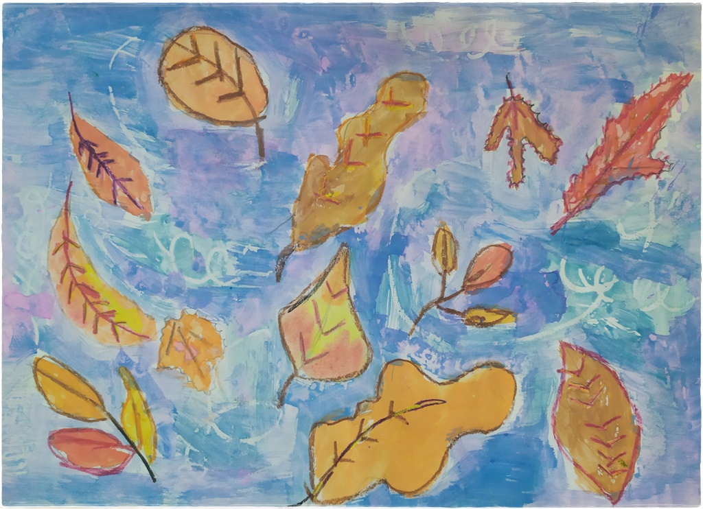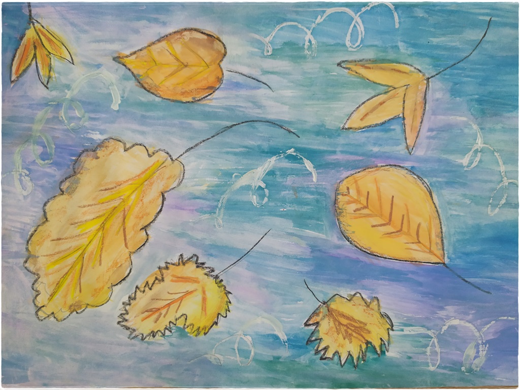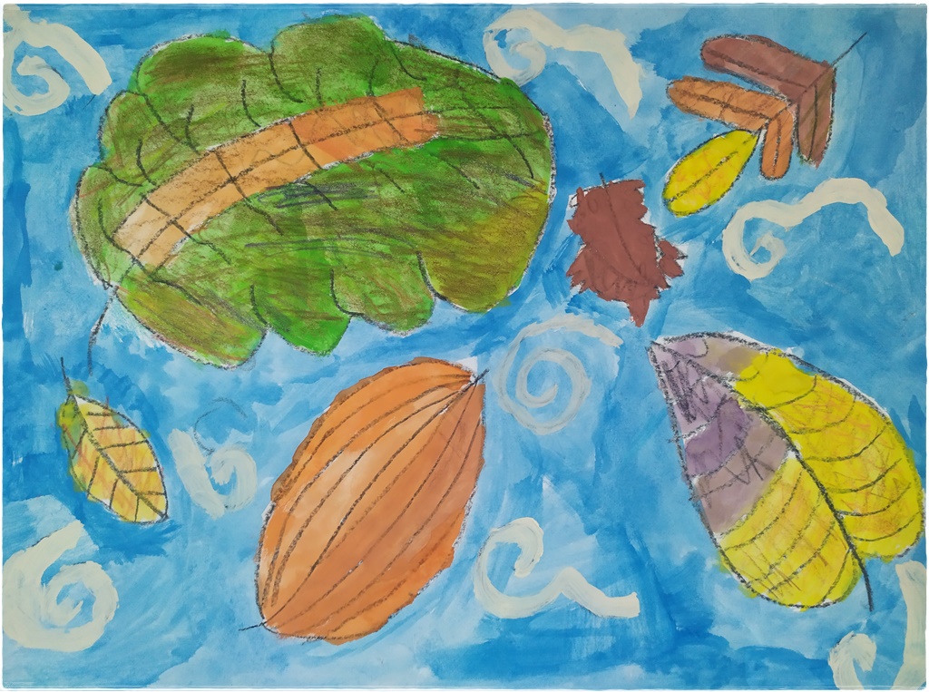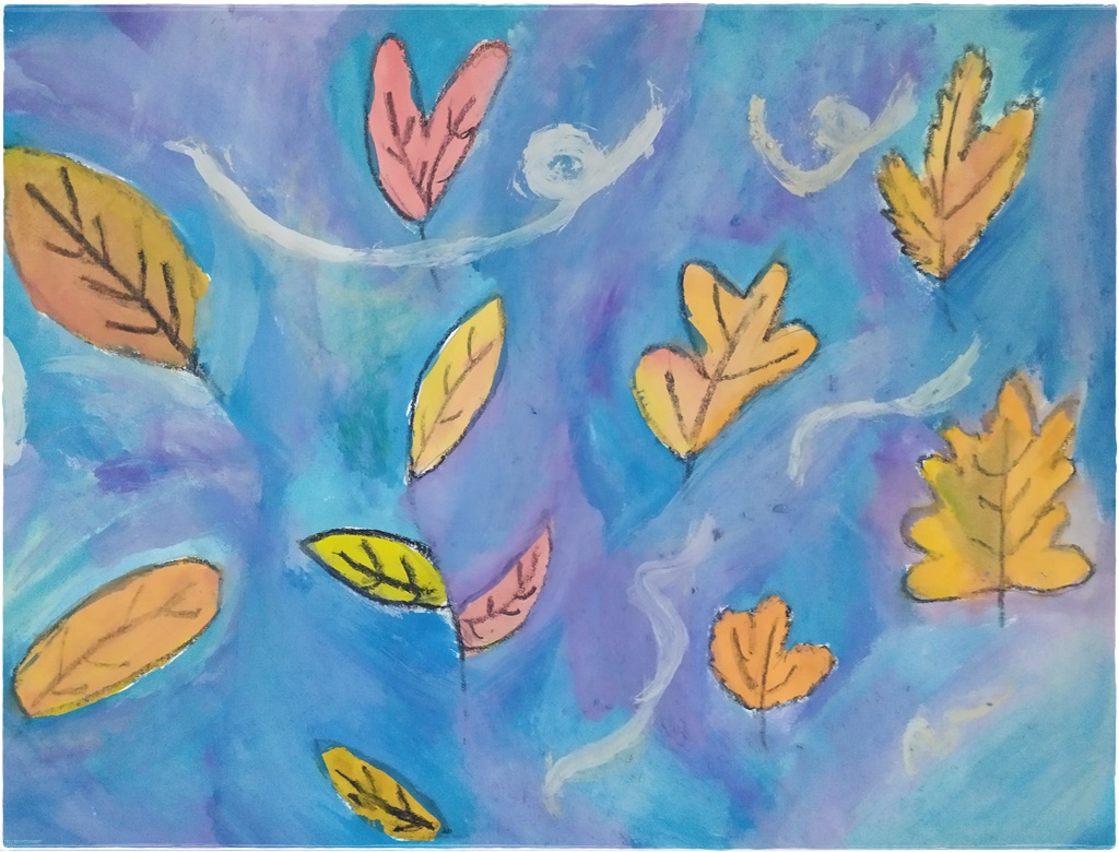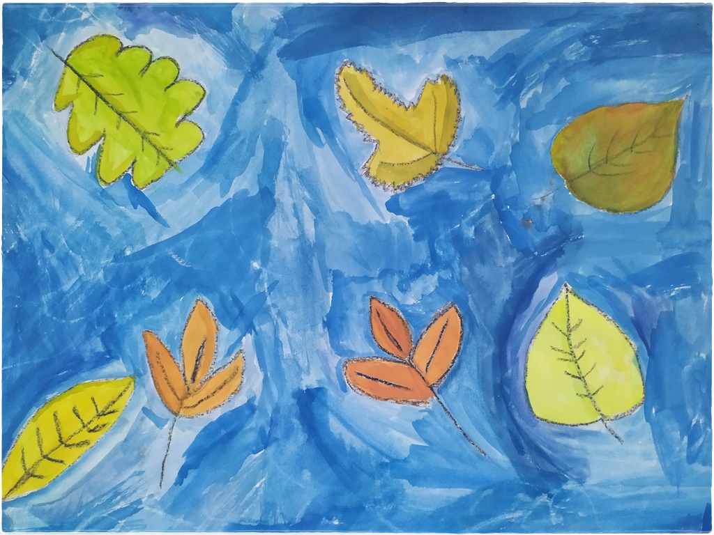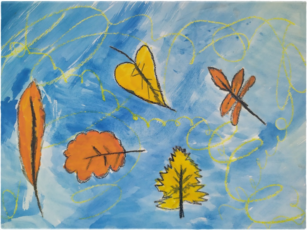 Композиција облика и контраст боја… и већ сам и радила ову јесењу тему, но свака генерација доноси свој печат и развија своје таленте, па увек радо у октобарским данима осликамо јесење лишће на ветру, напишемо и понеку причу коју би могао да нам исприча на свом путу.