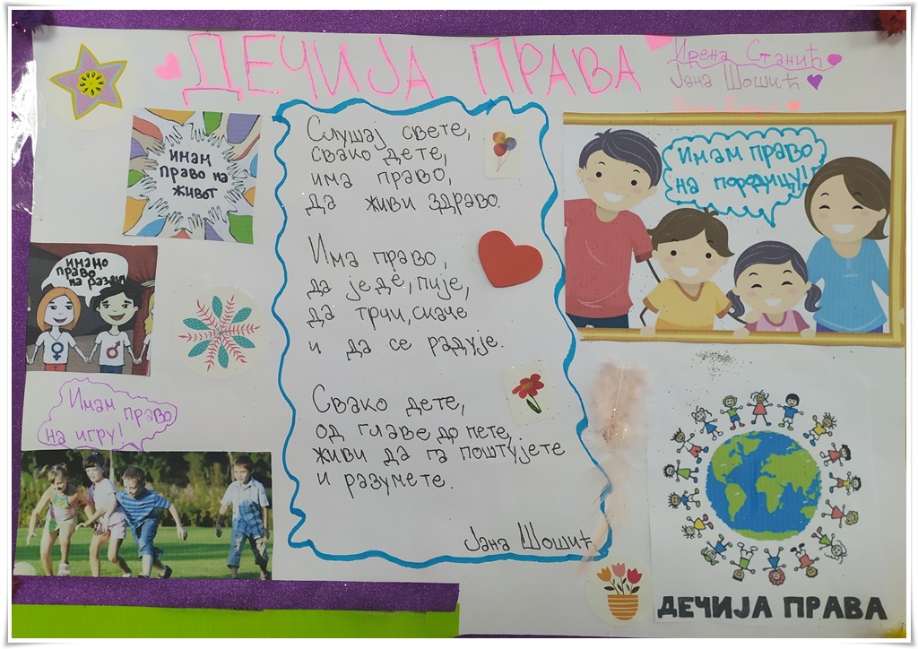 Кроз радионице на часовима грађанског васпитања смо се бавили дечијим правима и обавезама. Крајњи продукт нашег рада је Рекламни штанд дечијих права који смо креирали кроз групни рад.