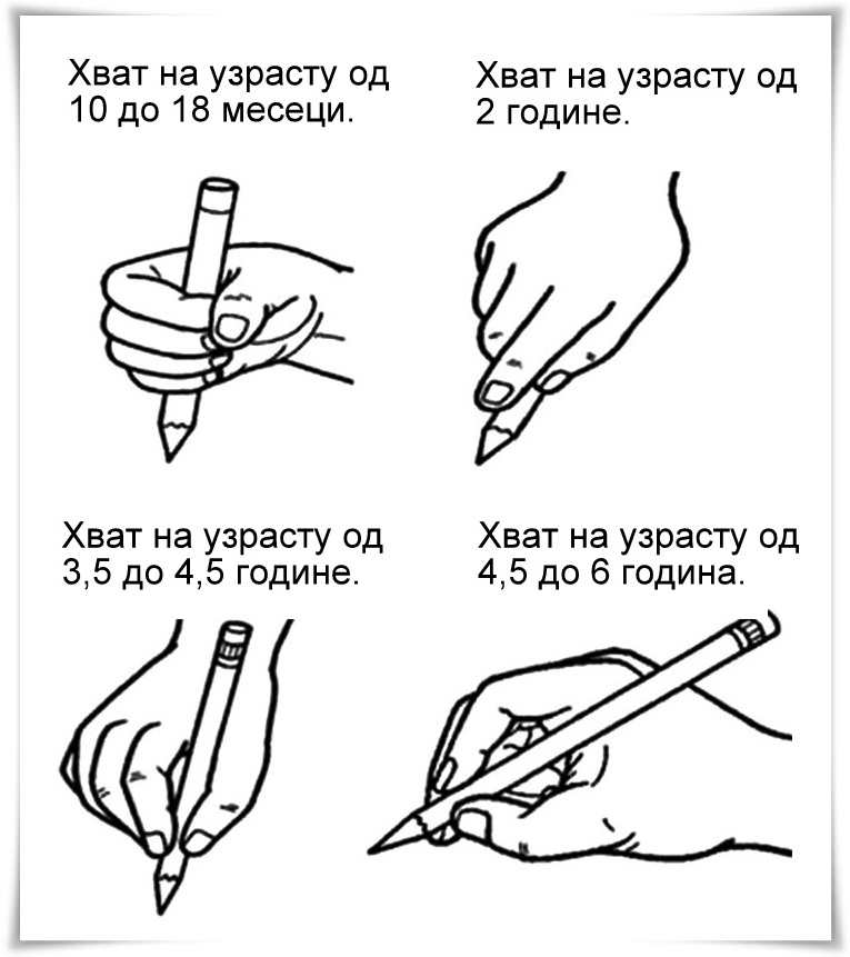10 – 18 месеци Шара потезима напред – назад по папиру. Оловку држи уз длан и обухвата је прстима (у шаци).