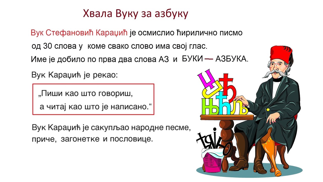 Вук Стефановић Караџић је рођен у Тршићу близу Лознице. У поридици је било пуно деце. У то време деца су умирала, па су му дали име Вук по народном обичају (како му духови и вештице не би наудили).Читање и писање је научио од Јефте Савића који је био у то време једини писмен човек у селу. Школовао се у Лозници, манастиру Троноша, Петрињу, Београду, Бечу… У Бечу је живео са својом породицом и радио свој просветитељски посао. У Бечу је умро, а сахрањен је у Београду у порти Саборне цркве. Вук Стефановић Караџић је реформатор српског језика, сакупљач народних песама и писац првог речника српског језика. Нашу азбуку је саставио Вук и она има 30 слова.