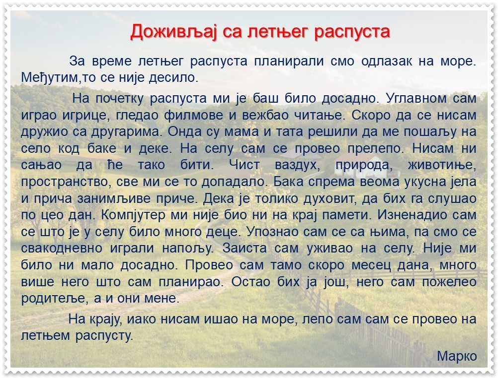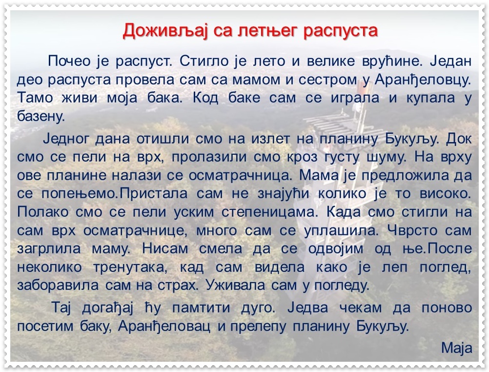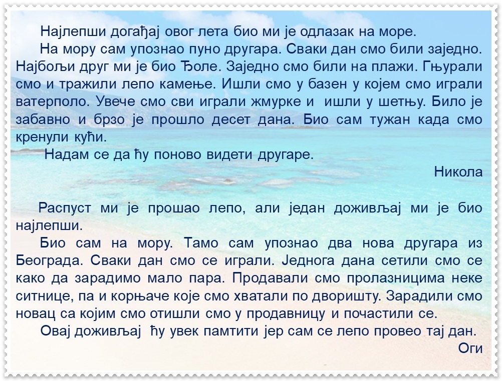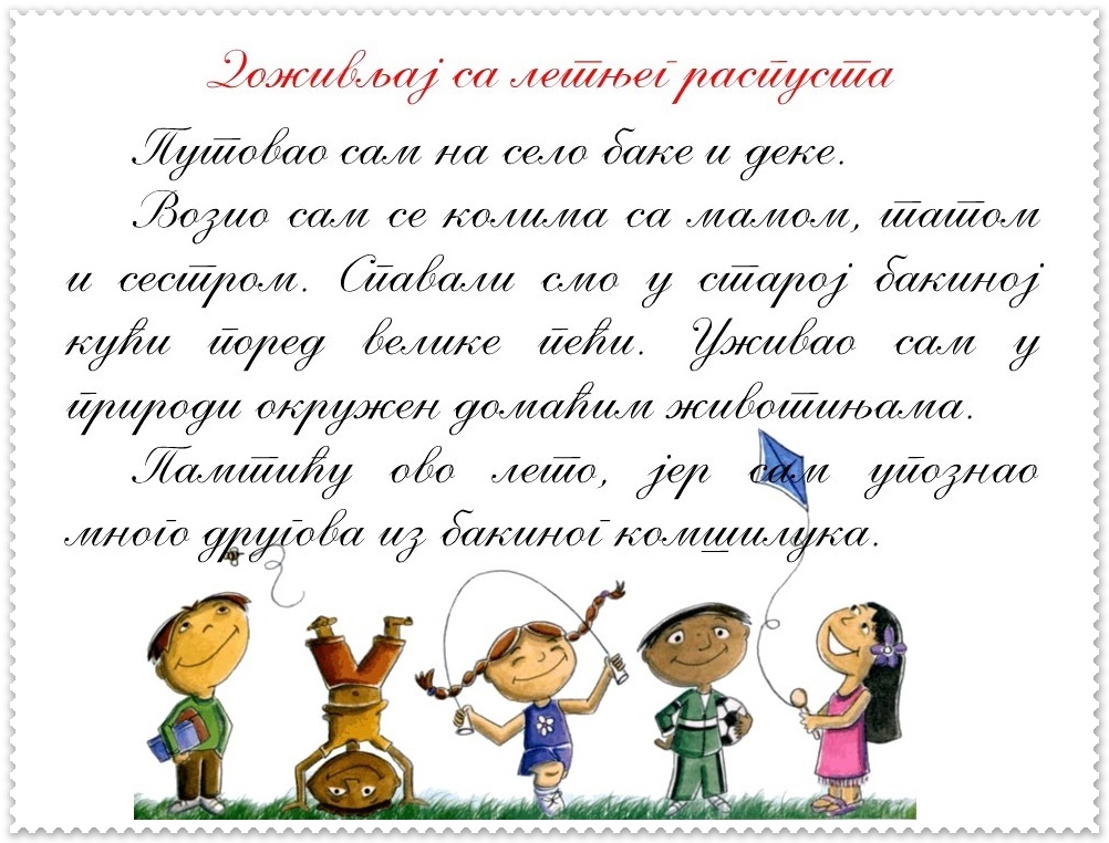 Ученик препричава догађај, изражајно описује доживљај, богати речник, разликује правилне и неправилне језичке изразе, примењује одговарајуће стилске изразе, пажљиво слуша саговорнике, поштује правила рада у групи, анализира, чита, пише, црта, сарађује, образлаже мишљење, процењује свој и туђ рад.