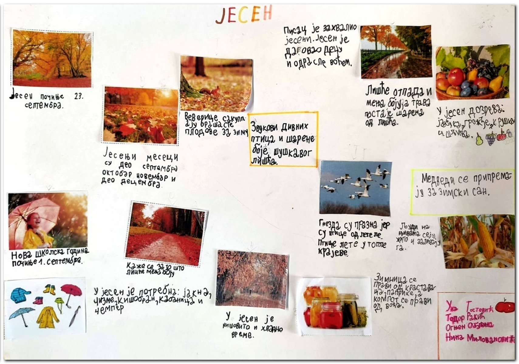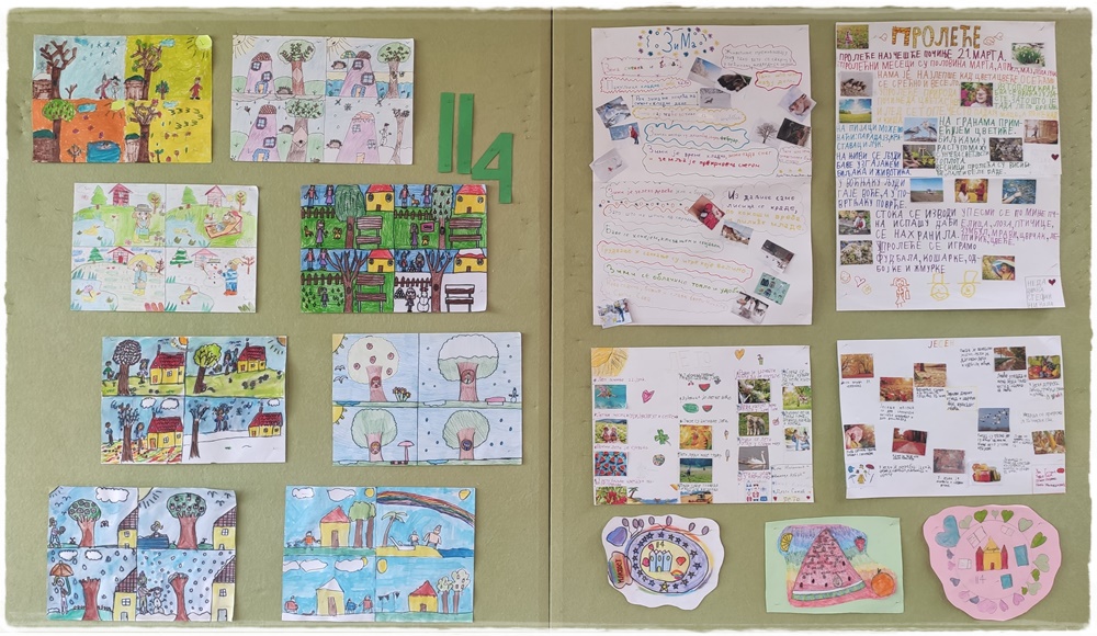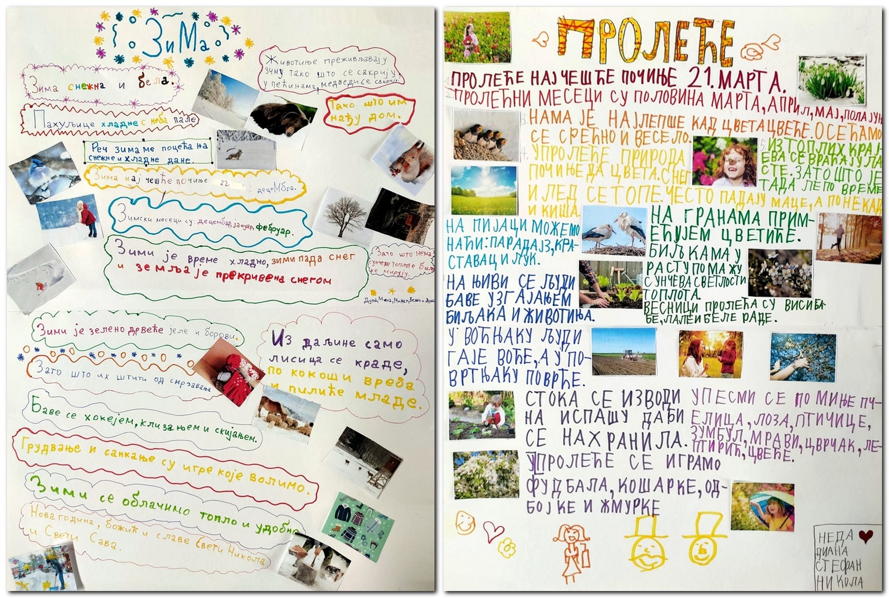 Кооперативним, интерактивним радом, ђаци креирају плакате о годишњим добима. На плакатима пишу одговоре на основу добијених питања. Ученици се договорају о подели задужења у групи (ко анализира илустрације у уџбенику, ко исписује текст, ко чита питања, ко сече и лепи сличице, ко је задужен за бојење и цртање на хамеру и сл.).