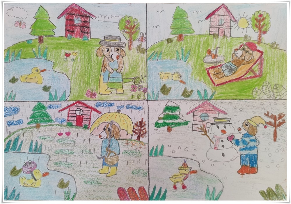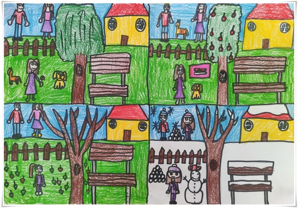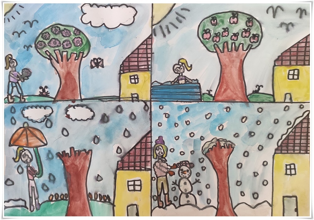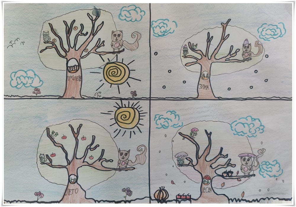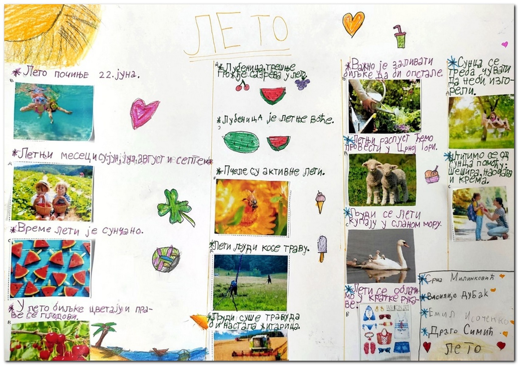 Кооперативним, интерактивним радом, ђаци креирају плакате о годишњим добима. На плакатима пишу одговоре на основу добијених питања. Ученици се договорају о подели задужења у групи (ко анализира илустрације у уџбенику, ко исписује текст, ко чита питања, ко сече и лепи сличице, ко је задужен за бојење и цртање на хамеру и сл.).