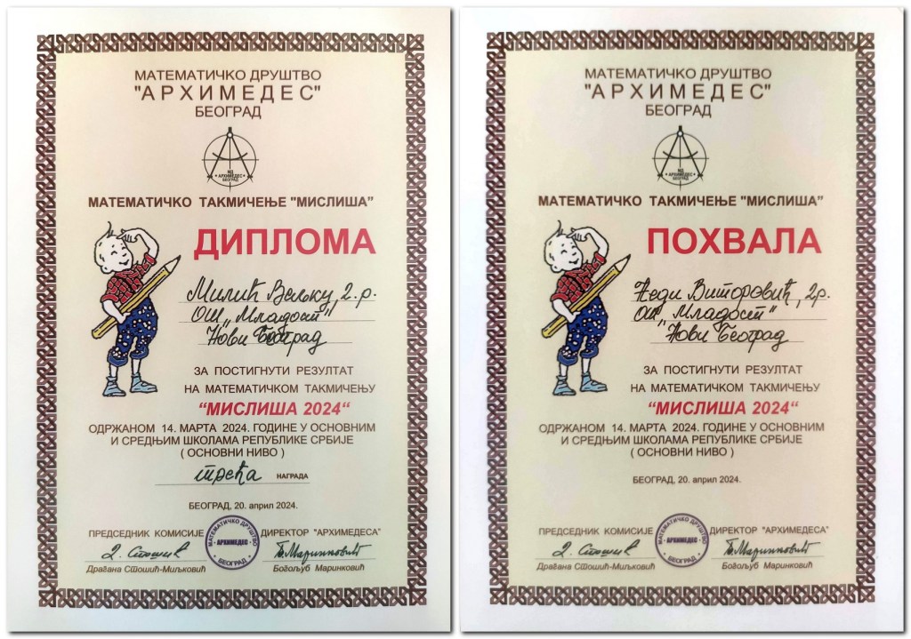 Национално математичко такмичење у организацији Математичког друштва Архимедес и наше Мислише освојили су похвалу и 3. награду на државном нивоу.