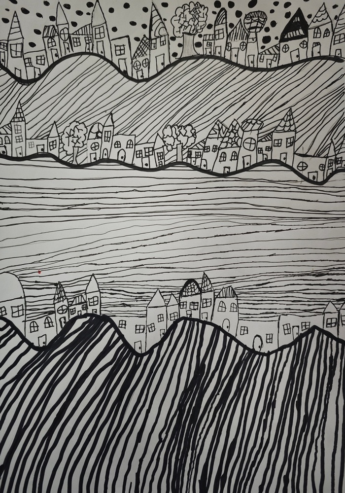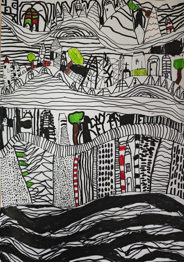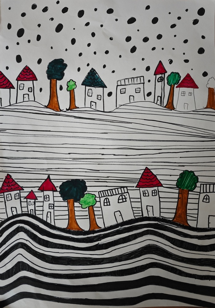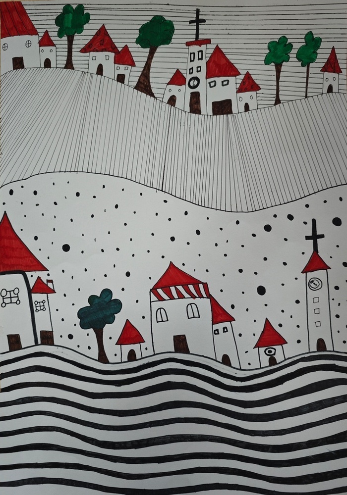 🎨 Техника: цртање фломастерима, неки делови обојени, неки остављени белим ради контраста.