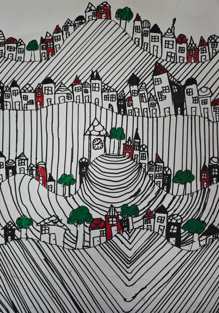 Линије се савијају, таласају, пресецају — као улице, кровови и реке у малом маштовитом граду.