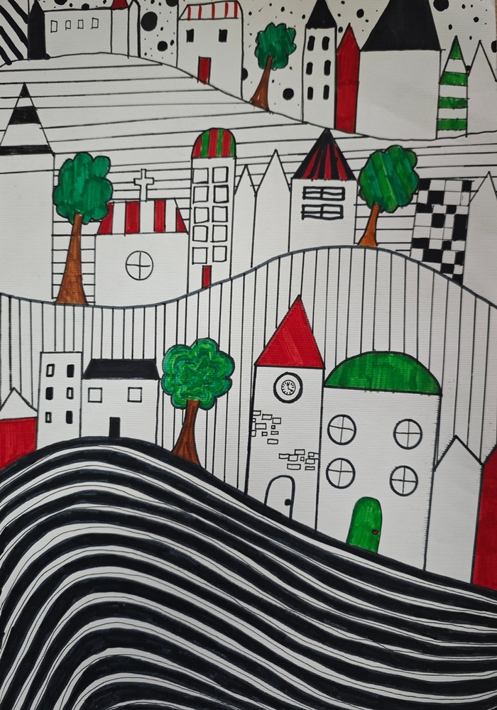 🏙️ На папиру су се појавили чудесни градови – кућице које расту на брежуљцима, дрвеће које плови између линија, кровови који се смењују као таласи.
